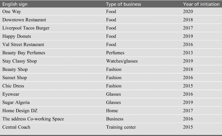 The current study focuses on the social aspect of the linguistic landscape discussed by Mensel et al. (Reference Mensel, Vandenbroucke, Blackwood, Garcia, Flores and Spotti2016), who clarify that the linguistic landscape is a reflection of the role played by language in the society. As such, linguistic data on bottom-up signs was collected and their connotations and representations in Algerian society were interpreted. The point at which English signs started to widely spread in Algeria and big Algerian cities was identified based on both the observations of the first author and also writings about it. A timeline of the spread of English was then compiled by referring to the earliest social media posts of the businesses under study and to field observations. Later, business owners were interviewed and pictures of different businesses were collected to explain the choices of English signs and the representations associated with English.