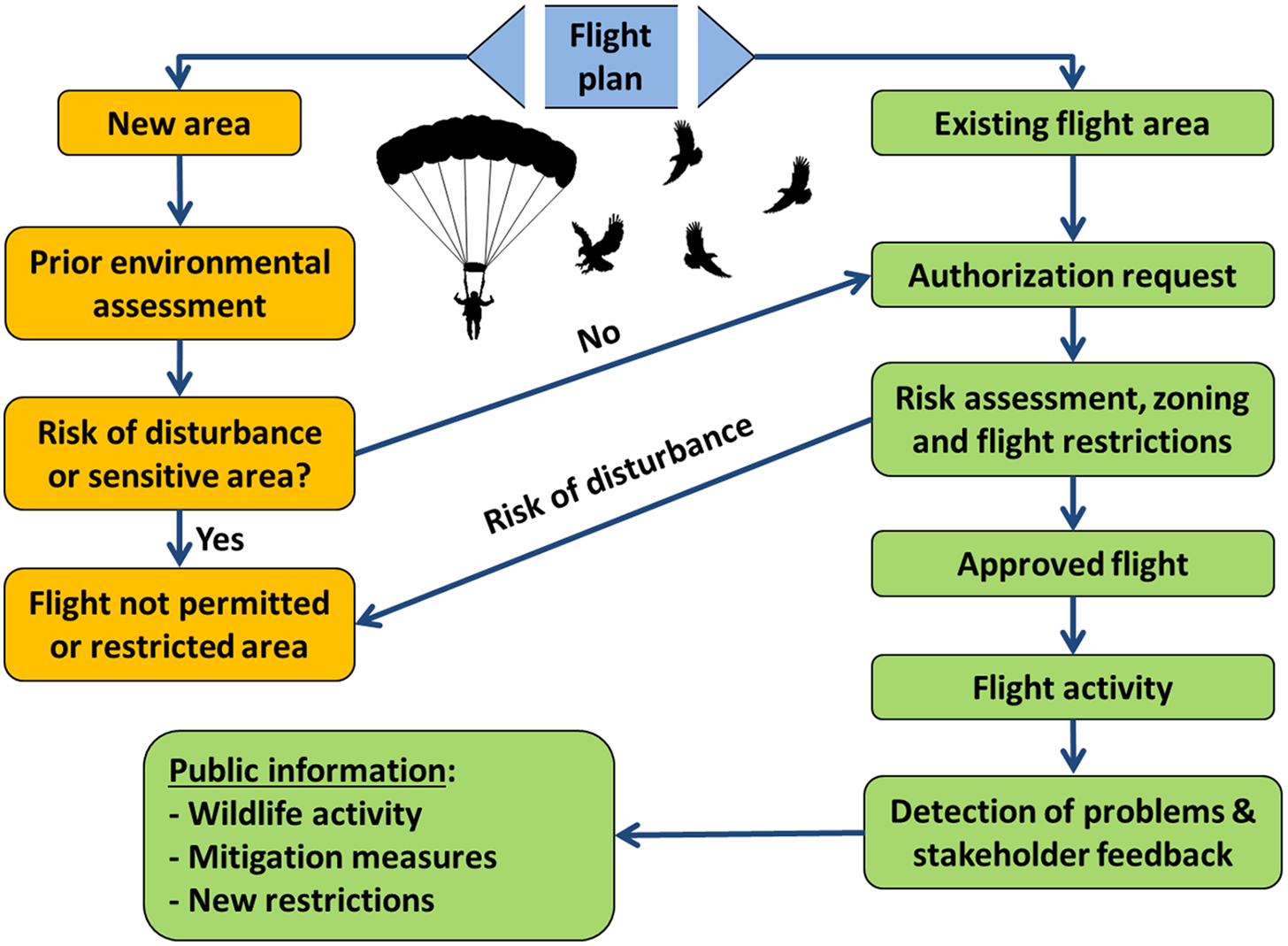 Impact studies on wildlife should be mandatory in newly proposed jump/take-off areas (Fig. 1 & Appendix S1). These impact reports should be presented by the club(s) interested in managing these new flight zones and then approved by a competent authority before any such new developments can proceed. It is also recommended that all jumps be recorded to enable the monitoring of disturbances caused by free-flight activities and by those who do not respect the recommendations/regulations in the flight zones concerned and, in turn, to persuade the users of these aircraft not to fly in unauthorized zones and at times where unnecessary disturbance to wildlife would arise.