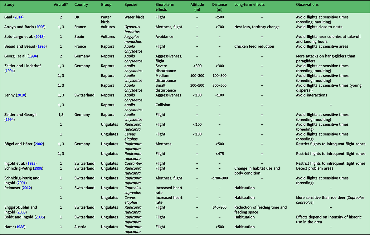 Although there is a large body of research on human disturbance on birds (e.g., Verhulst et al. Reference Verhulst, Oosterbeek and Ens2001, Quan et al. Reference Quan, Wen and Yang2002, Blackmer et al. 2004), very few publications consider the disturbance to bird species caused by free-flight activities (raptors (n = 5), vultures (n = 2), water birds (n = 1); Table 1). The data available on the effects of free-flying on waterfowl in wetlands are almost non-existent (Gaal Reference Gaal2014). Similarly, data on the effects on raptors are limited to the bearded vulture (Gypaetus barbatus) on its breeding territories (Arroyo & Razin Reference Arroyo and Razin2006) and the golden eagle (Aquila chrysaetos), mainly on its reaction to the presence of free-flight craft in areas where they share airspace (Georgii et al. Reference Georgii, Zeitler and Hofer1994, Beaud & Beaud Reference Beaud and Beaud1995, Jenny Reference Jenny2010). Data on the effects of free-flight on other species such as passerines or medium- to small-sized birds are limited to a single study (Table 1).