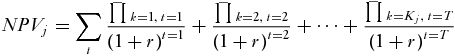 \hbox{\it NP}{V_j} = \sum\limits_t {\frac{{\prod {_{k = 1,\,t = 1}} }}{{{{(1 + r)}^{t = 1}}}} + \frac{{\prod {_{k = 2,\,t = 2}} }}{{{{(1 + r)}^{t = 2}}}} + \cdots + \frac{{\prod {_{k = {K_j},\,t = T}} }}{{{{(1 + r)}^{t = T}}}}}