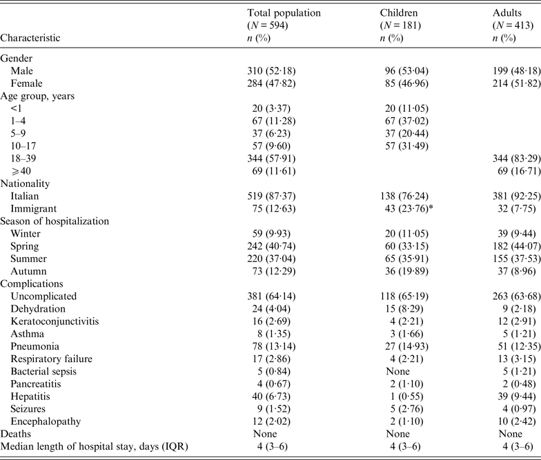 Median age in the children subset was 5 (IQR 1–12) years and median age in the adult subset was 29 (IQR 23–36 years). Median age of the entire population included in the study was 23 (IQR 14–32) years. The majority of cases occurred in the 18–39 years age group (57·91%). One quarter of the children cases were immigrants (23·76%), whereas 92·25% of the adult cases were Italian. Median length of hospital stay was 4 (IQR 3–6) days in both the children and adults group.