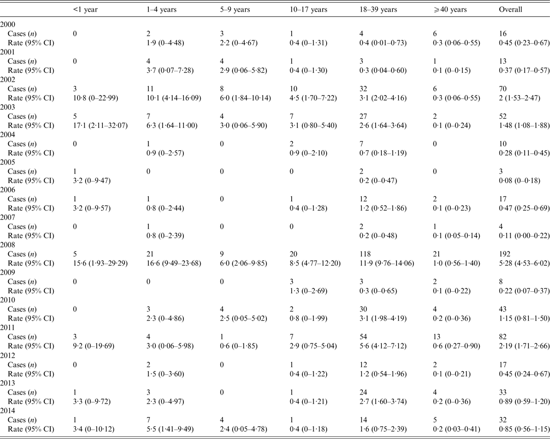 Table 2. Yearly absolute number of cases and hospitalization rate/100 000 for measles (95% CI) by age group in Tuscan children and adults, 2000–2014