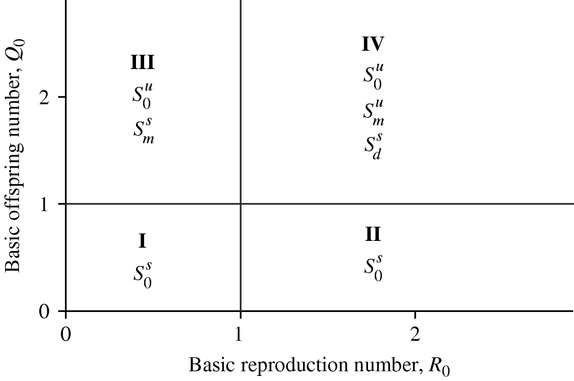 The Appendix gives the steady-state analysis corresponding to the above three equilibrium points: the steady state regarding the mosquito-free community S 0 is stable if Q 0⩽1; the equilibrium where the community is disease-free S m, is stable if Q 0>1 and R 0⩽1; and dengue settled at an endemic level S d is stable if Q 0>1 and R 0>1. Hence, depending on the values assigned to Q 0 and R 0, one of three equilibrium points acts as an attractor. Figure 1 summarizes the basins of attraction. The changes of the attraction equilibrium point (bifurcations) in the positive parameter space (Q 0,R 0) occur for lines Q 0=1 and R 0=1. In region I (Q 0<1 and R 0<1) and in region II (Q 0<1 and R 0>1) the unique equilibrium point is S 0, which is stable. This is the reason no bifurcation occurs when line R 0=1 is crossed when passing from region I to region II. In region III (Q 0>1 and R 0<1) there exist two equilibrium points S 0 and S m, which are, respectively, unstable and stable. When passing from region I to region III, crossing line Q 0=1, one bifurcation occurs: i.e. as S m becomes stable S 0 becomes unstable. In region IV (Q 0>1 and R 0>1) there exist three equilibrium points S 0, S m and S d, which are unstable, unstable and stable, respectively. In going from region II to region IV, crossing line Q 0=1, S d becomes stable and S 0 becomes unstable; however, the passage from region III to region IV, crossing line R 0=1, results in another bifurcation: S d becomes stable and S m becomes unstable. In the accumulation point (Q 0=1 and R 0=1) any type of bifurcation can occur. Note that region II is the most dangerous, due to the fact that we can have the bifurcation from being mosquito-free to the prevalence of dengue disease in this region, if the basic offspring number can be increased, i.e. >1. This is perfectly possible if the temperature increases in this region and alters the entomological parameters in order to achieve Q 0>1.