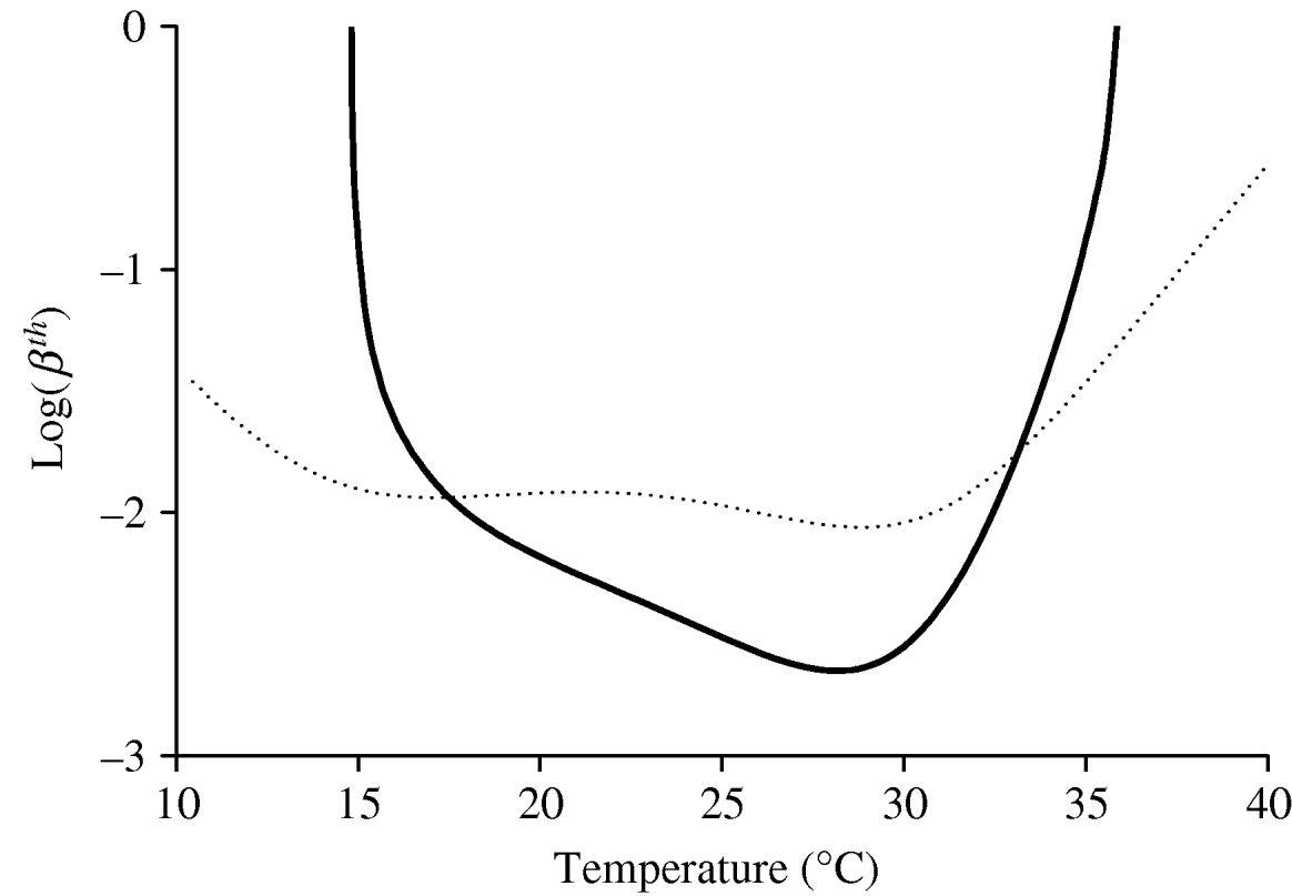 , in the sense that the lower this threshold number, the higher was the possibility of dengue outbreak. In particular, the curve for βth (Fig. 2) is roughly inverse with respect to the curve obtained for Q 0 (see [Reference Yang6]), and one reason for this behaviour is that we did not allow the disease-related parameters (intrinsic and extrinsic incubation periods and recovery rate) to vary with temperature. Hence, the basic offspring number Q 0 can be taken as the measure of the potential risk of dengue outbreak and also with regard to the severity of dengue epidemics. It should be noted that the temperature at which the lowest value for βth occurs is 28·0°C, which is 1·2°C lower than the temperature at which the maximum value for Q 0 occurs (see [Reference Yang6]).