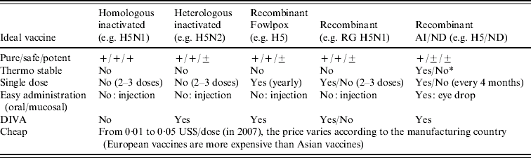 Table 2. Review of the advantages and limits of avian influenza vaccines currently licensed on the market against criteria for an ideal vaccine
