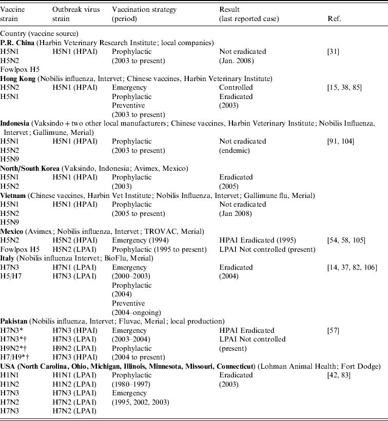 AI vaccines have been used in Mexico, Italy, Pakistan, and the United States to control LPAI. Previous to the HPAI H5N1 outbreak in South East Asia (2003), only a few attempts to control HPAI outbreaks by the means of vaccination have been reported: the HPAI H5N2 outbreak in Mexico (1994) and the HPAI H7N3 outbreak in Pakistan (2003) [Reference Naeem and Siddique57, Reference Villarreal58]. Table 5 presents a synthetic review of the AI vaccination strategies used in the field according to the country and the type of AI virus (HP or LP) and a brief summary of the outcome of the vaccination campaigns.