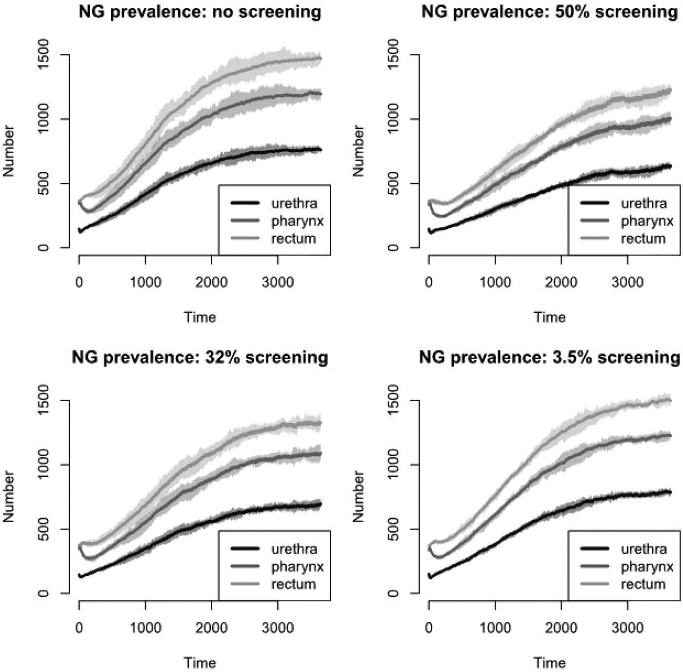 Table 2. NG prevalence at day 3650 for various screening levels at pharynx, urethra and rectum, respectively