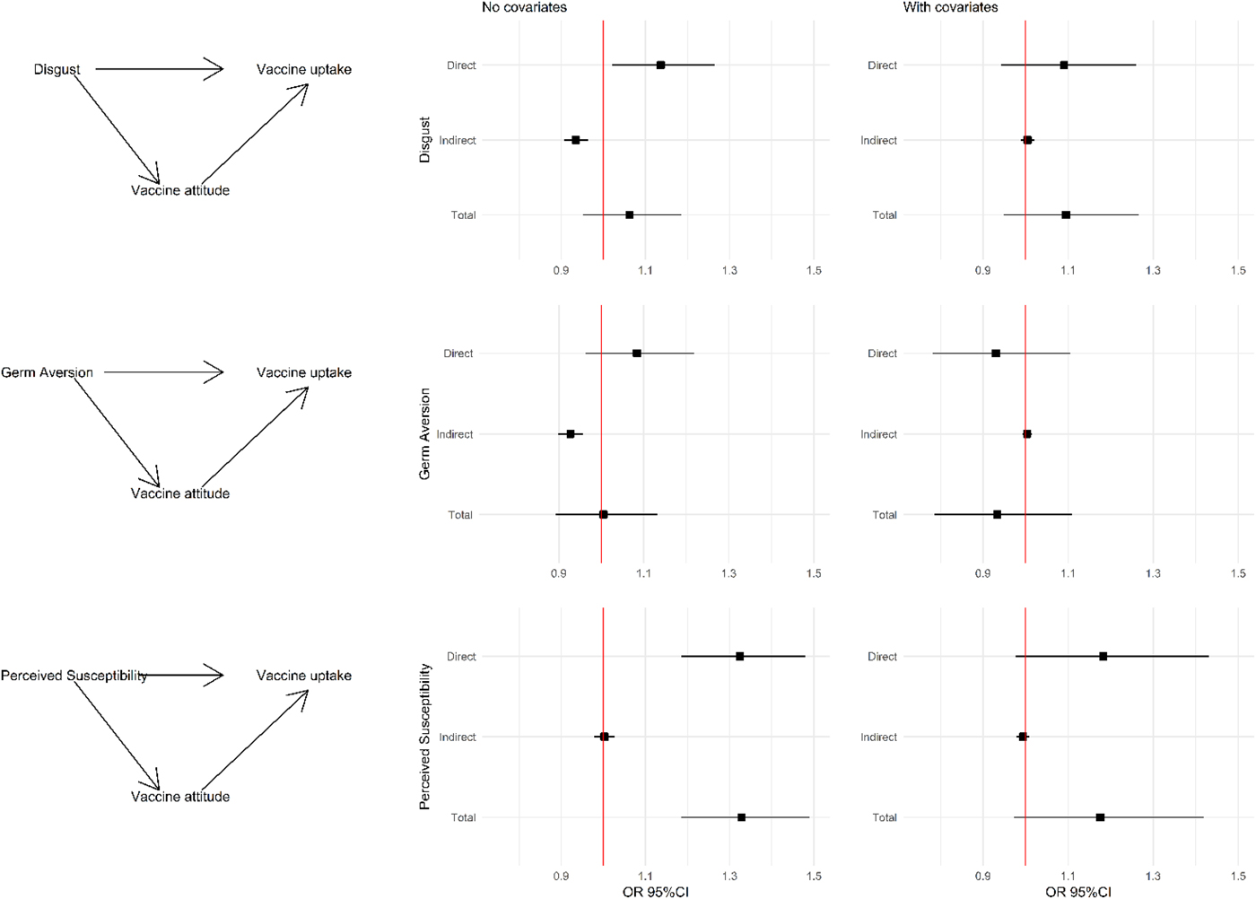 Fig. 1. Mediation analysis: left column: causal diagrams showing the direct and indirect (through vaccine attitude) effects of disgust sensitivity, germ aversion and perceived susceptibility on vaccine uptake. Middle column: odds ratio and 95% confidence interval for the estimated direct, indirect and total effects. Right column: odds ratio and 95% confidence interval for the estimated direct, indirect and total effects when also adding covariates to the model. Note: Disgust score was adjusted to the same scale as the other variables by dividing the score by four. Footnote: Covariates included in the model were: annual income, vaccine offered at the workplace, belong to a priority group as per CDC recommendations, perceived susceptibility to flu, perceived risk of infection without vaccination and perceived benefits and barriers of the flu vaccine.
