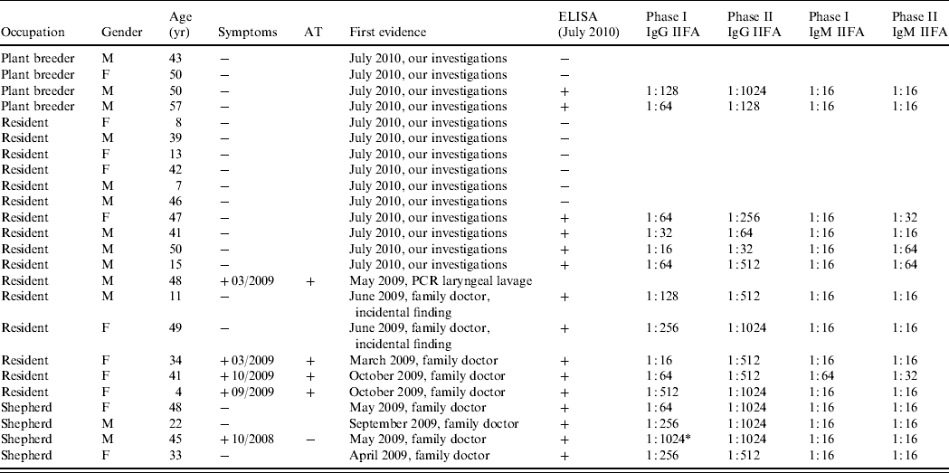 In June 2009 two residents consulted their family doctor for other matters and were found incidentally to have antibodies to Q fever. The other ten residents and the four plant breeders did not know their serological status until our investigations took place in July 2010. In the serum samples of four residents and two plant breeders, antibodies against C. burnetii were found, but they could not remember any clinical symptoms within the previous 2 years (Table 2).