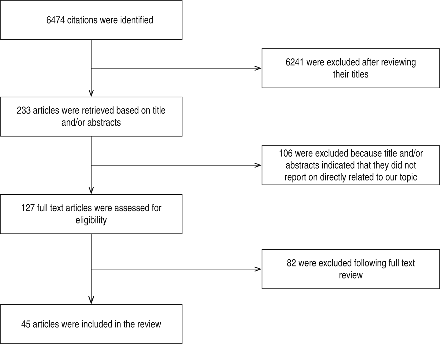 A research paper published between 1992 and 2014 shows the included studies were varied in terms of research methods and study site. As summarized in Figure 1, our electronic search resulted in 6474 citations. Finally, 127 articles were retrieved for full text review and 45 papers were determined to meet eligibility criteria and included in this review. Of the 45 relevant articles, 10 each were from Russia and Africa, seven from Asia, eight from Europe and five each from South America and the USA (Fig. 2). The prevalence of TB in prisons has been reported to be 3- to 1000-fold higher than that found in the civilian population (Table 1). In addition, high levels of multidrug-resistant (MDR)-TB at 54·8% and extensively drug-resistant (XDR)-TB at 11·1% have been reported from prison settings (Table 2). According to a WHO report in 2013, the notified XDR-TB cases among countries are shown in Figure 3. Multiple risk factors such as overcrowding, poor ventilation, malnutrition, HIV, and others have fuelled the spread of TB in prisons (Fig. 4). The most common recommendations by investigators to prevent and control the spread of TB in prison setting were active case-finding, followed by implementation of directly observed treatment, short course (DOTS)strategy and the need for improved mycobacteriological laboratory services (Table 3).