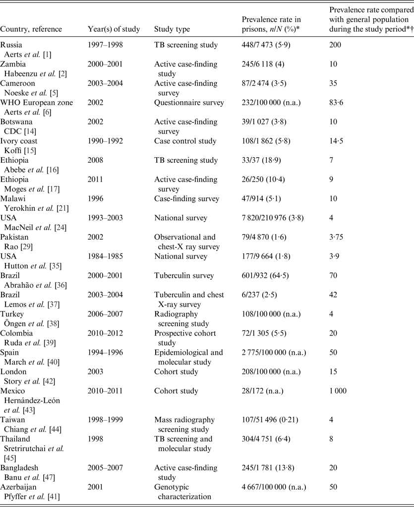 Table 1. A summary of prevalence studies reporting TB in prisons
