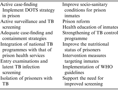 The recommendations by investigators to prevent and control the spread of TB in the prison setting are presented in this review. Thus, according to the investigators, active case-finding and TB screening, adequate case-finding and containment strategies, implementation of DOTS strategy in prison, integration of a national TB control strategy with that of prison health services, entry examination for active and latent TB infection screening, intervention measures targeting inmates, the need for improved mycobacteriological laboratory services, and the need for improved screening and isolation of prisoners with TB were the reported recommendations to tackle TB in prisons [Reference Aerts1, Reference Habeenzu2, Reference Aerts6, 14–Reference Moges17, Reference Yerokhin, Punga and Rybka21, Reference Rao29, Reference Öngen38–Reference March40, Reference Chiang44, Reference Sretrirutchai45, Reference Banu47]. According to our review the most common recommendations by investigators to control TB in the prison setting were active case-finding followed by implementation of DOTS strategy and the need for improved mycobacteriological laboratory services. These control measures published in different journals provide much needed evidence for responsible agencies to renovate their effort to prevent the spread of TB in prison. In addition, each recommendation including the WHO guideline are available on how best to control and prevent TB in prisons [30].
