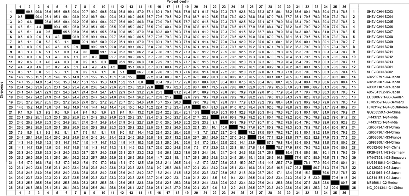Phylogenetic analysis of the 13 SHEV ORF2 partial sequences amplified by DNAStar software and the 20 reference sequences downloaded from GenBank domestically and internationally was carried out. The data from some SHEV ORF2 sequences from 2016 to 2017 in select cities of Sichuan Province were used as the SHEV epidemic strains for a genetic evolution relationship diagram (Fig. 4). A phylogenetic tree based on the ORF2 partial sequence showed that the SHEV sequencing results were closest to sequence of the known Chinese strain but that the SHEV strains and the known Chinese strain were located on different branches; the SHEV strains grouped with the Korean strain.