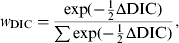 where ΔDIC was the difference between the model in question and the minimum value of the DIC for the models being compared, and the denominator was the sum of the differences over all the models being compared. The best-fitting model out of those compared will be that with the highest DIC weight, and a value close to 1 indicates strong evidence that it is the best model.