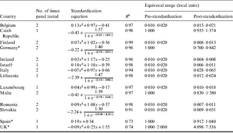Table 2. Numbers of times the panel was tested, standardization equations, R2 values, and pre- and post-standardization equivocal ranges (in local units) for each participant country