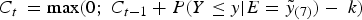 $C_{t\;} = {\rm max}(0;\;C_{t - 1} + P(Y \le y \vert E = \tilde y_{(7)} ) - \; k)$