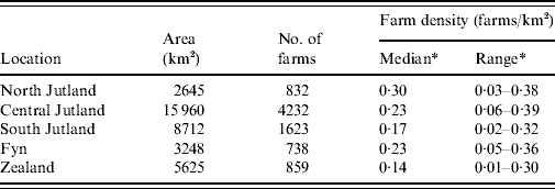 Slaughter-pig farm density showed large variation both at the country-wide and at the local level in Denmark in 2003. The areas of highest farm density are Viborg and Nordjylland on the Jutland peninsula (0·47 farms/km2); the lowest are on the island of Zealand. The distribution pattern of farms followed a random inhomogeneous Poisson process and although farms had near neighbours they did not spatially aggregate. With regard to Salmonella seropositivity we found consistent evidence for spatial dependency at distances of ~4 km. The strength of the spatial dependency varied throughout the country being proportional to farm density. Our findings were in accord with those reporting short distances between farms [Reference Berends23], being a neighbour of an infected farm [Reference Langvad24] and pig density [Reference Fedorka-Cray, Gray, Wray, Wray and Wray22] as potential risk factors for Salmonella infection in pigs.