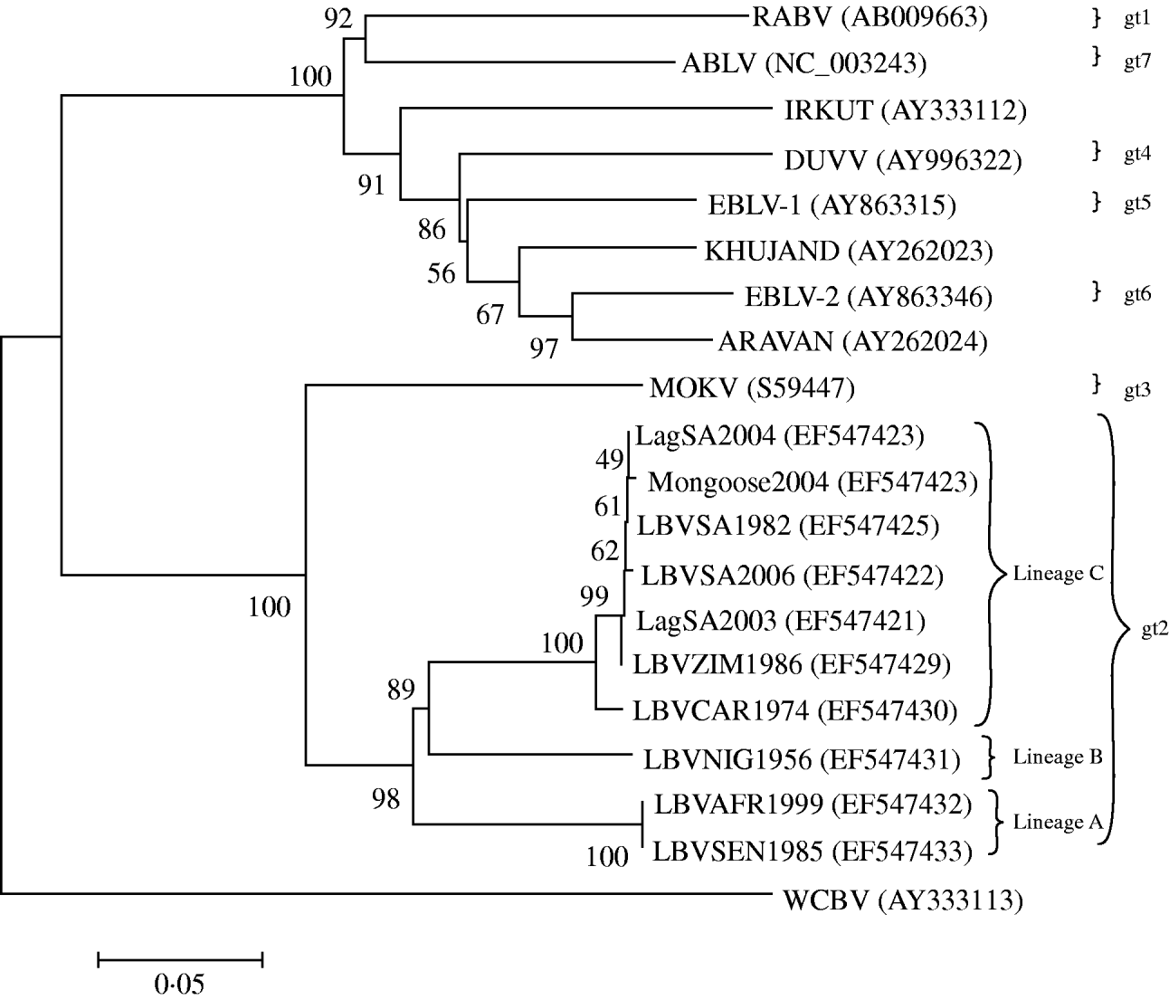 The authors thank Dr C. T. Sabeta (Agricultural Research Council, Onderstepoort Veterinary Institute, Rabies Unit, South Africa) for providing the MOKVSA(252/97) and LBVSA1982 isolate and Dr F. Cliquet [Agence Française de Sécurité Sanitaire des Aliments (AFSSA), France] for providing the LBV1999AFR isolate. This study was supported in part by the National Research Foundation of South Africa, the University of Pretoria International Affairs Officee's Postgraduate Study Abroad Bursary Programme, and the US National Vaccine Program Office. Use of trade names and commercial sources are for identification only and do not imply endorsement by the U.S. Department of Health and Human Services. The findings and conclusions in this report are those of the authors and do not necessarily represent the views of the funding agencies.