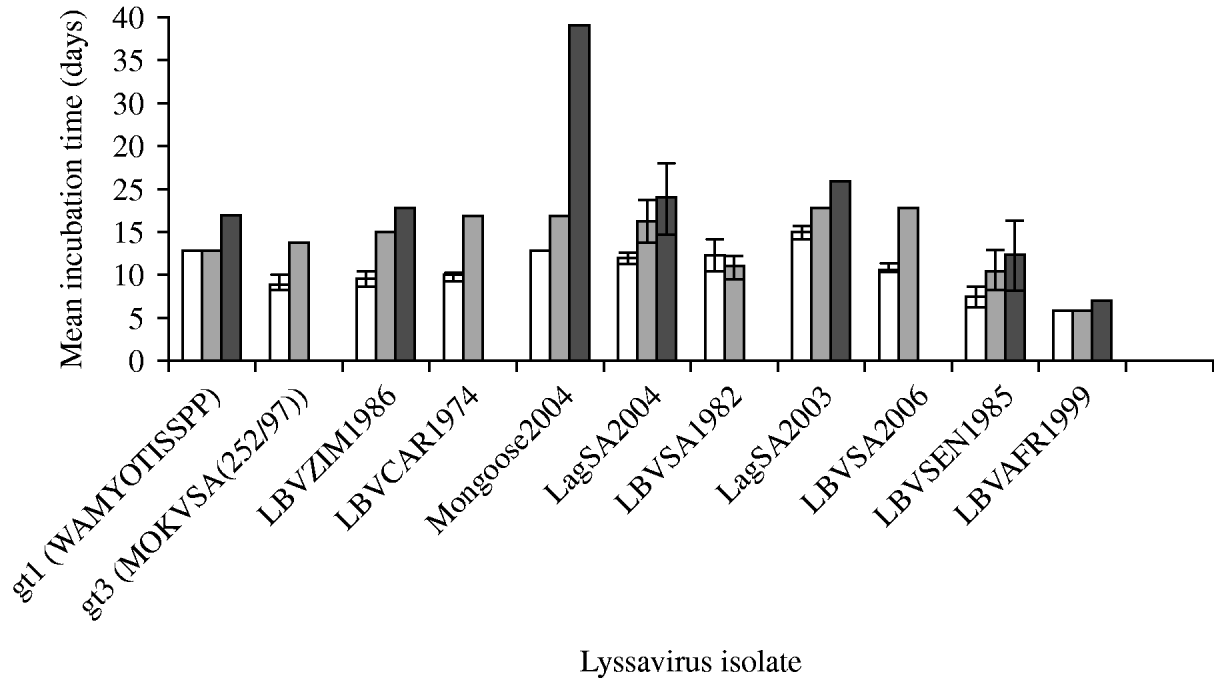 The aspect of relative pathogenicity, with reference to inoculum dose and route of inoculation, is an important criterion in considerations of lyssavirus ecology. Previous studies suggested that phylogroup II lyssaviruses were not pathogenic when introduced peripherally. These assertions contributed directly to the suggestion that such viruses are generally less pathogenic, and imply that they have limited public health and veterinary significance [Reference Badrane5]. In the present study we have assessed the susceptibility of mice to various isolates that are classified within the lyssavirus gt2 (LBV) in comparison to one isolate each from gt1 (RABV) and gt3 (MOKV). A single isolate of MOKV and RABV (known to be virulent) were included for the purpose of comparison. When inoculated i.c., all lyssaviruses in our panel caused acute progressive encephalitis (rabies). However, differences were observed when these viruses were inoculated i.m. at peripheral sites distant to the central nervous system (CNS).