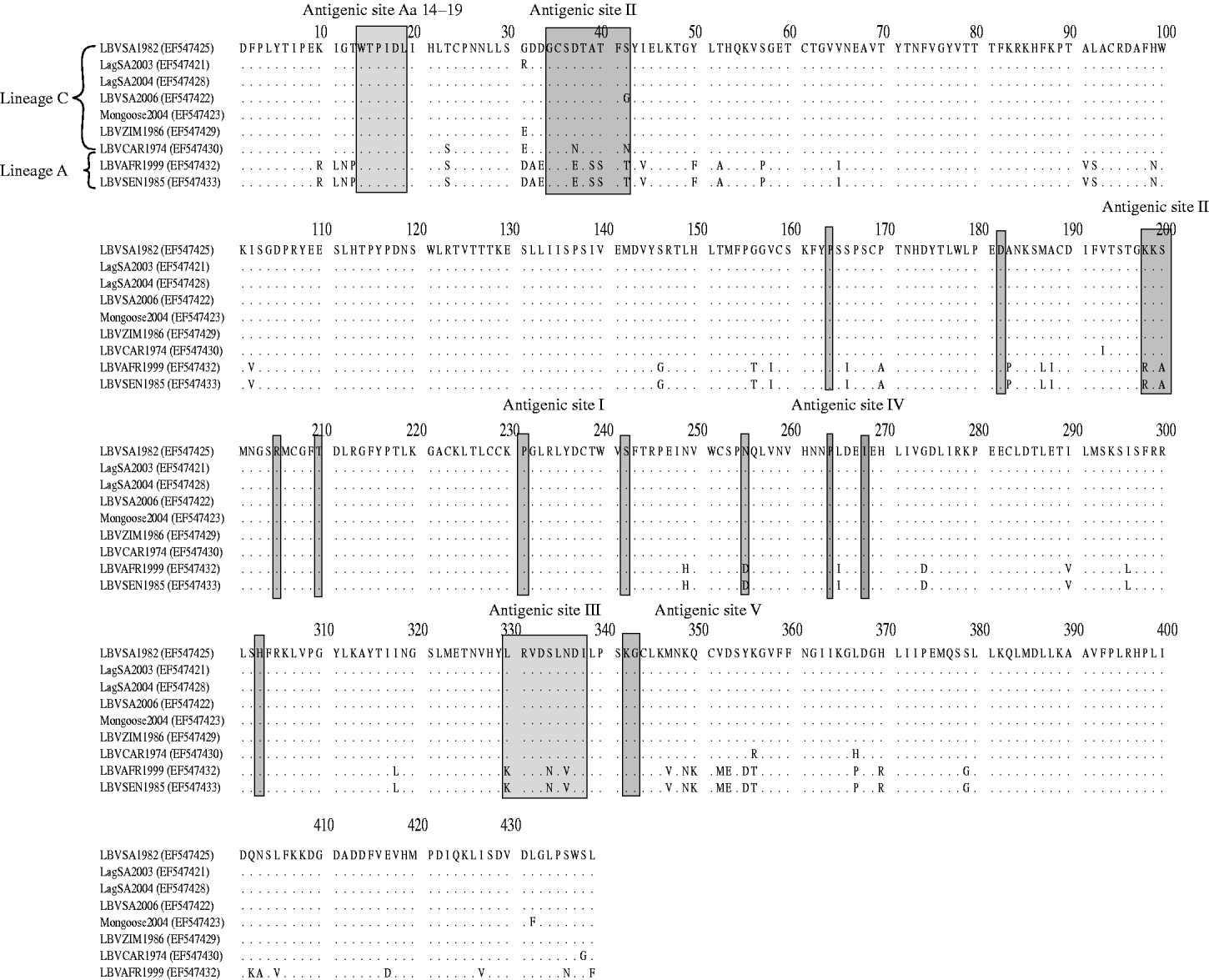 Domains of the lyssavirus G that were previously implicated in pathogenesis were compared between viruses used in our study and other representatives (Figs 4 and 5). Amino-acid positions 330 and 333 on the ectodomain were found to be conserved in genotypes 1, 4, 5, 6, 7, ARAV, IRKV and KHUV but not in gt2, gt3 and WCBV. In gt2 and gt3 isolates, Arg/Lys333 was replaced by an aspartic acid (Asp) (Fig. 4). With the exception of two lineages (B and C) of gt2 and WCBV, Lys330 was found to be conserved within the Lyssavirus genus. The isolates belonging to lineages B and C of gt2, were found to possess Leu330. In contrast, isolates belonging to lineage A of gt2 contain Lys330, similar to all other lyssavirus genotypes. A multiple alignment of G sequences of gt2 representatives used in this study is shown in Figure 5. The lineage A isolates (LBVSEN1985 and LBVAFR1999) demonstrated significant sequence diversity in comparison to the other gt2 isolates. Within antigenic site II (positions 34–42 and 198–200), sequence diversity was found at positions 37 and 42 between lineage C isolates and at positions 37, 39, 40, 42, 198 and 200 between the more pathogenic LBV lineage A and the less pathogenic LBV lineage C. Substitutions were also observed in aa 330, 334 and 336 of antigenic site III between lineage A and lineage C isolates. No differences were observed between LBV isolates for other known antigenic sites within G. When anlaysing other sites on the G previously implicated as being significant for pathogenicity (positions 164, 182, 205, 210, 242, 255, 268, 303) only position 205 indicated an amino-acid difference between lineage A and lineage C isolates (Fig. 5).