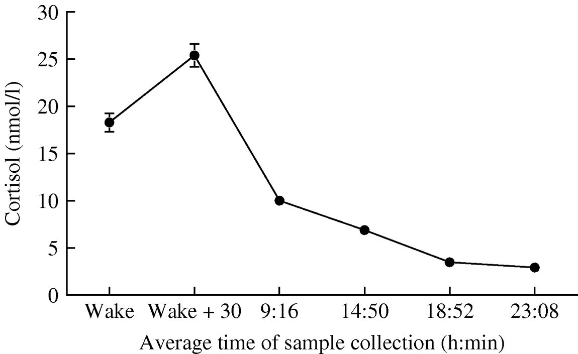 Fig. 1. Mean salivary cortisol at the six assessment points over the day. Error bars are standard error of the mean (s.e.m.).