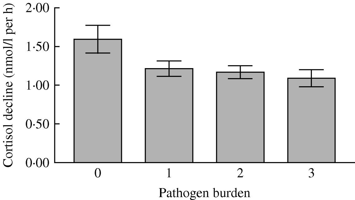 The flatter cortisol decline over the day in participants with a greater pathogen burden was driven primarily by differences in cortisol levels on waking. Separate analysis of the waking values showed a significant association with pathogen burden after adjustment for age, gender, SES, BMI, smoking status, self-rated health, cardiovascular medication, depression and time of waking (P=0·031). Cortisol levels on waking were higher in participants with zero pathogen burden scores. By contrast, pathogen burden was not related to cortisol at bedtime (P=0·63), although values were lowest in participants with zero pathogen burden.