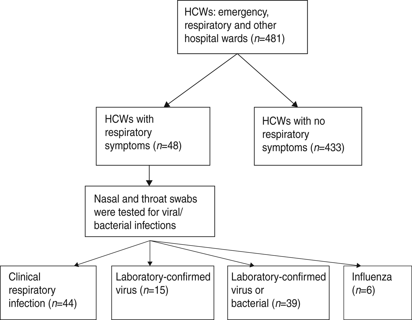 We prospectively studied 481 hospital HCWs from wards including emergency and respiratory wards from nine hospitals in Beijing, China over a 5-week period from 1 December 2008 to 15 January 2009. These 481 subjects were a control group in a larger study [Reference MacIntyre27].