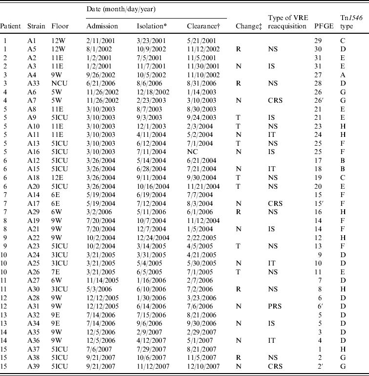 VRE, Vancomycin-resistant enterococci; PFGE, pulsed-field gel electrophoresis; W, general ward in the west wing; E, general ward in the east wing; NCU, neurosurgical intensive-care unit; 5ICU, medical intensive-care unit; 3ICU, surgical intensive-care unit; NC, not cleared; R, Discharge and readmission after VRE clearance; N, No change of admission; T, transfer patient to other ward after VRE clearance; NS, new strain; IS, identical strain; CRS, closely related strain; IT, identical Tn1546 type; PRS, possibly related strain.