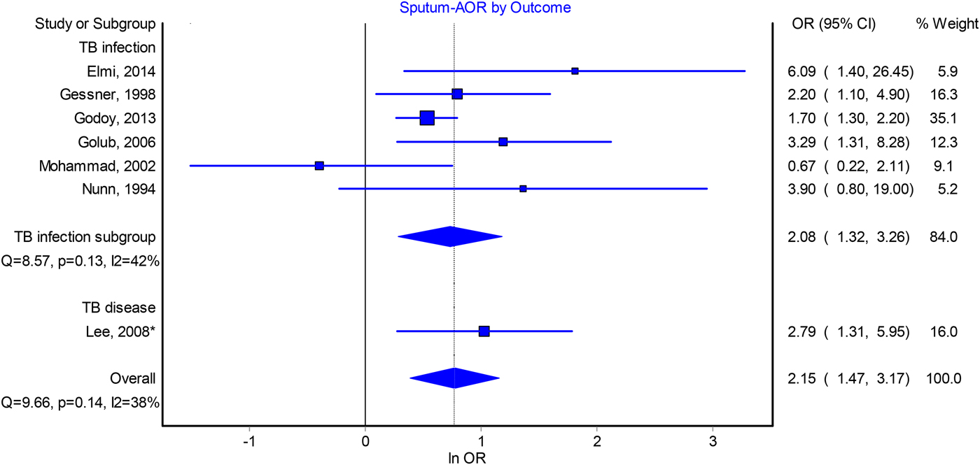 Fig. 3. Forest plot of the association between index patient HIV seropositivity and infectiousness from adjusted odds ratio analysis. *Indicates that these studies take contact active disease as an outcome. AOR, adjusted odds ratio; OR, odds ratio; CI, confidence interval.