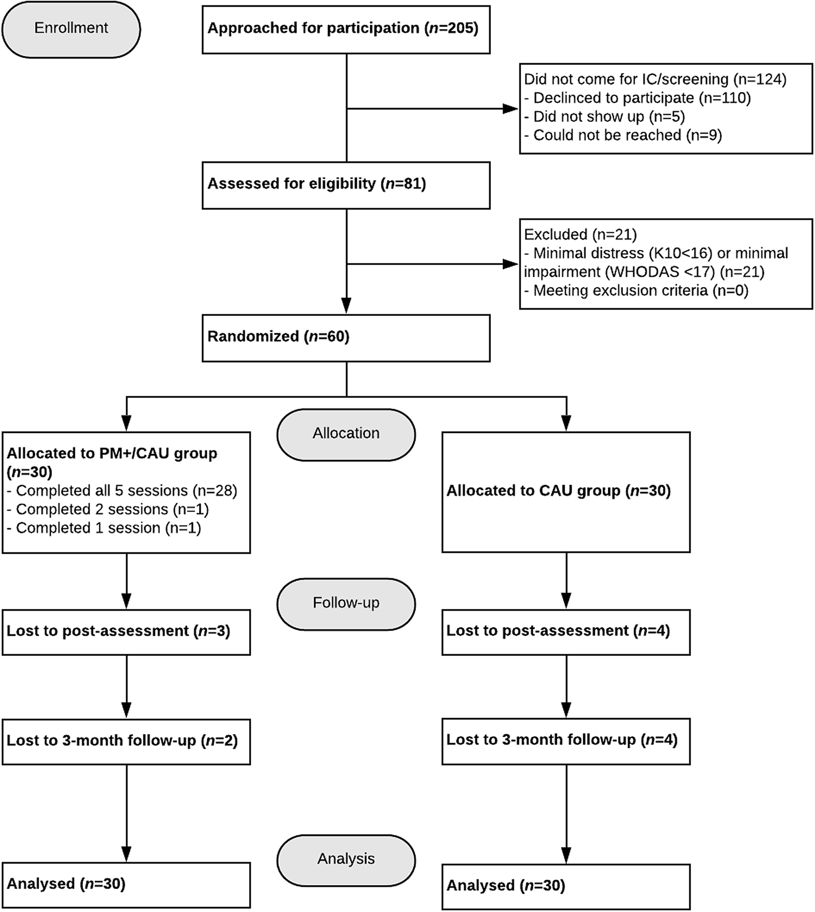 Recruitment occurred from April to November 2018. In total, 205 individuals gave permission to SNTR staff to be contacted by the VU research team. Of these, 110 declined, ten were unreachable and five did not attend screening. Eighty-one participants gave IC and were screened for eligibility to participate. Of these, 60 participants were included and randomised into PM+/CAU (n = 30) or CAU alone groups (n = 30). Figure 1 presents the CONSORT flow diagram.