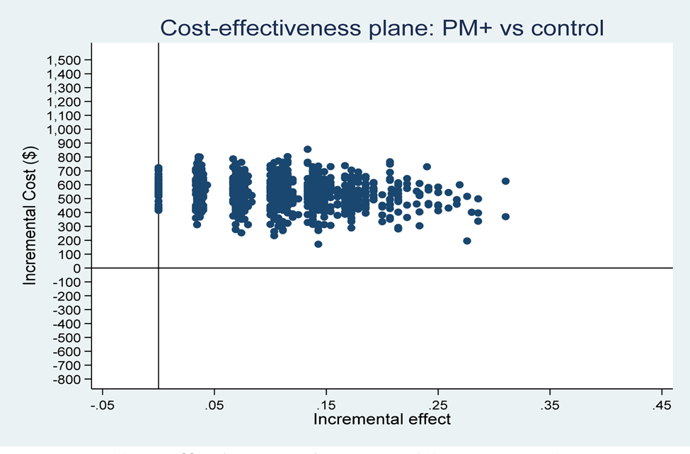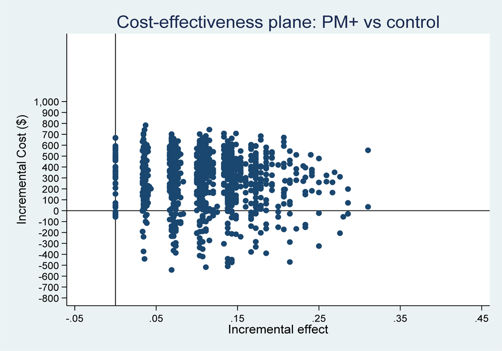 Fig. A3 Cost-effectiveness plane: PM+/CAU v. CAU per improvement achieved (health system perspective).