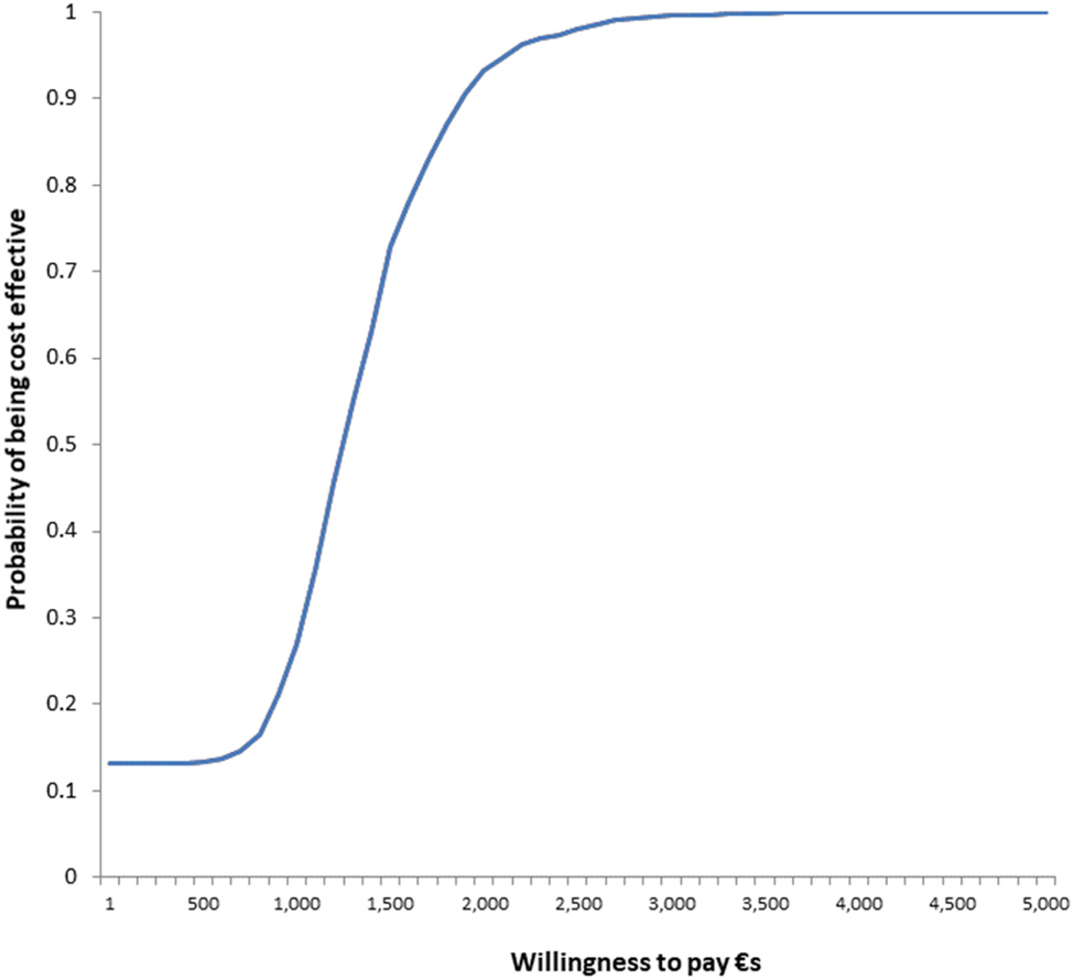Fig. A7 Cost-effectiveness acceptability curve: willingness to pay per recovery achieved from PM+/CAU intervention (health system perspective).