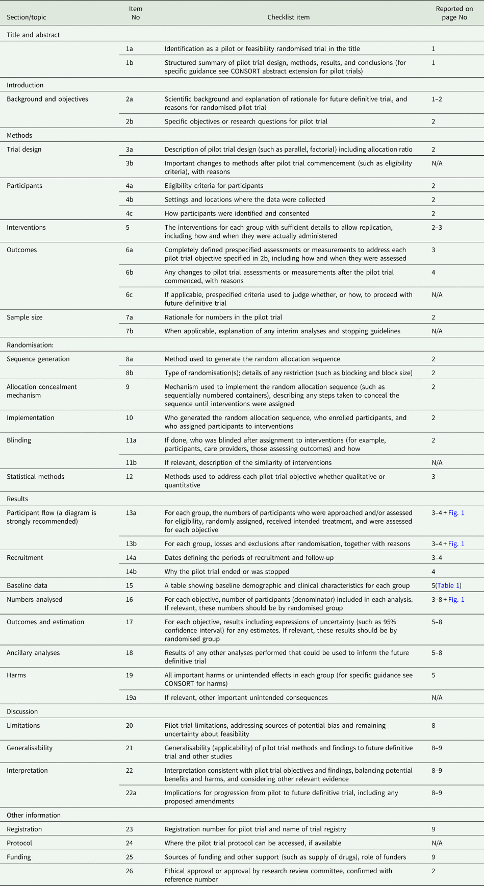 Checklist A1. CONSORT 2010 Checklist of information to include when reporting a pilot or feasibility trial