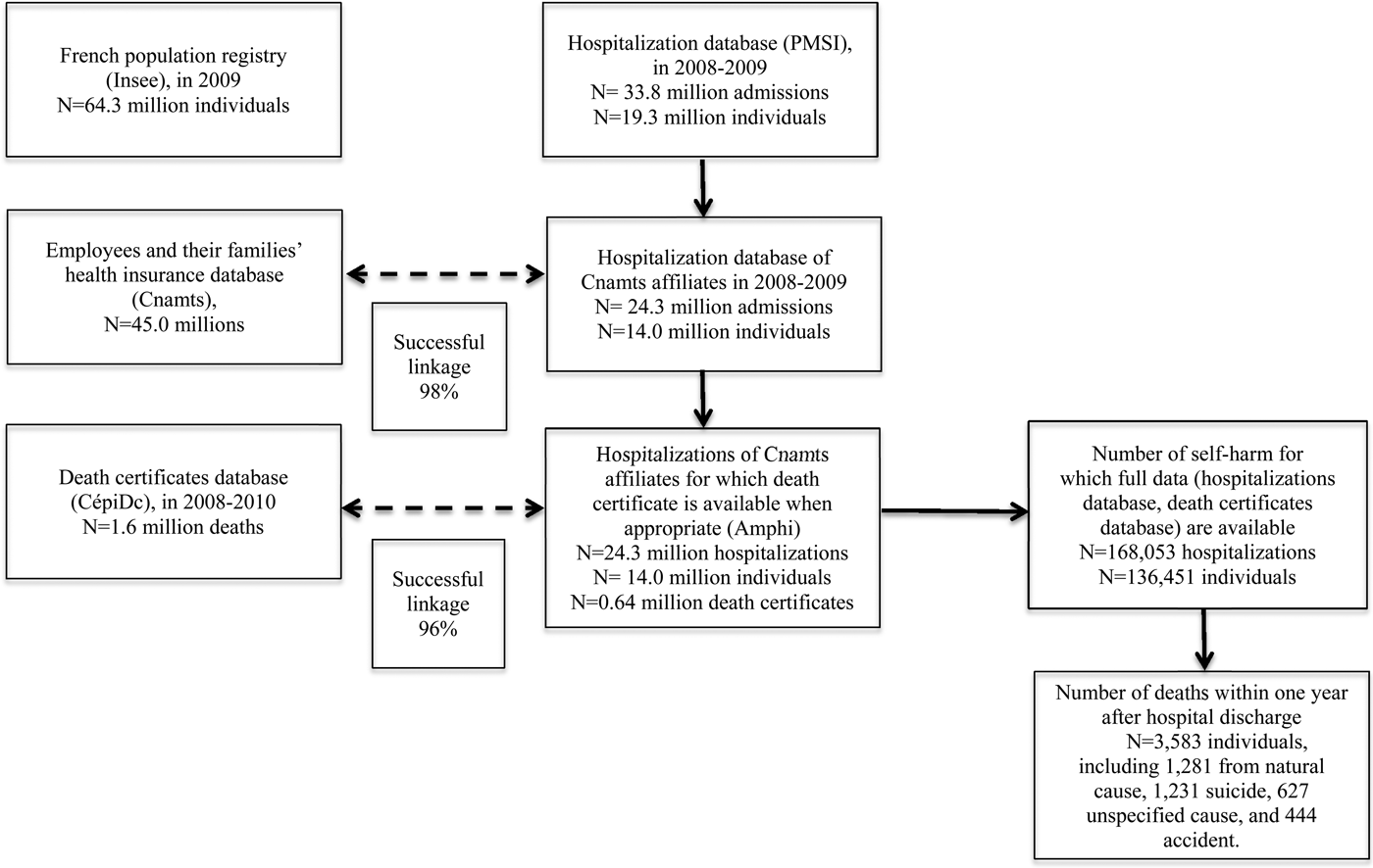 We extracted data on individuals hospitalised for non-fatal DSH – corresponding to ICD-10 codes X60 to X84 – from 1 January 2008 to 31 December 2009. This extraction yielded 168 053 hospitalisations after exclusion of patients who died during the index hospitalisation, corresponding to 136 451 individuals and 0.7% of the total number of hospitalisations for the study population during this period. Based on probabilistic linkage according to different variables (the month and year of birth, full date of death, gender and residency location), mortality data could be obtained from CepiDc for 96% of the sample (see flow chart in Fig. 1). In order to investigate the representativeness of the data obtained from the Amphi database used in the current study in comparison with the whole PMSI database, we compared age and gender distributions in people who presented with DSH and found a very satisfactory overlap (data available on request).