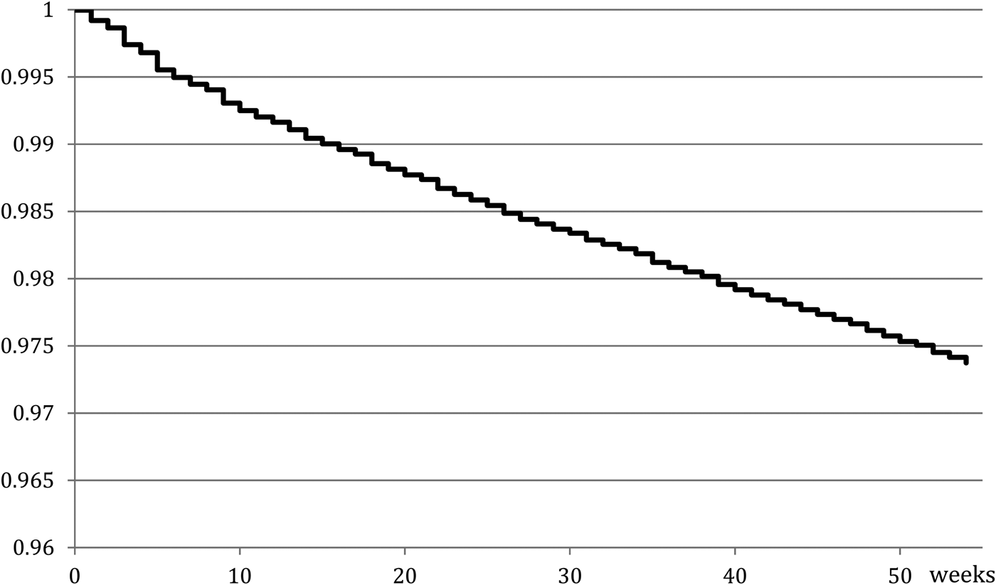 The death occurred in 2.6% (N = 3583) of the total sample within 1 year following the index DSH episode. Figure 3 shows the global survival curve over the 1-year follow-up. The SMR relative to expected deaths in the general population was 8.5 in men (from 3.3 in those aged 76 and above, to 24.5 in 26–35 s), 6.6 in women (from 2.8 in 76 + to 28.9 in 26–35 s) and 7.5 overall.