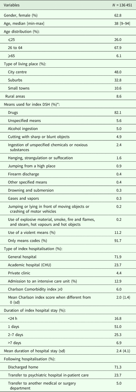 We considered the first hospitalisation for DSH within the studied period as the index DSH episode. For each patient, socio-demographic and medical data were collected at the index hospitalisation: age, gender, type of hospital, distance from home to hospital, type of living place according to the zip-code, admission to intensive care unit, Charlson comorbidity index (Charlson et al., Reference Charlson, Pompei, Ales and MacKenzie1987), duration of hospital stay, transfer following initial care and means used for the index DSH episode. In the dataset, there were no missing data for all these variables except for zip-code (0.4% of missing data). Psychiatric diagnoses were not retained due to a high number of data missing (53% of individuals) and an expected lack of reliability in the way diagnoses were carried out in Emergency departments and medical/surgery facilities.
