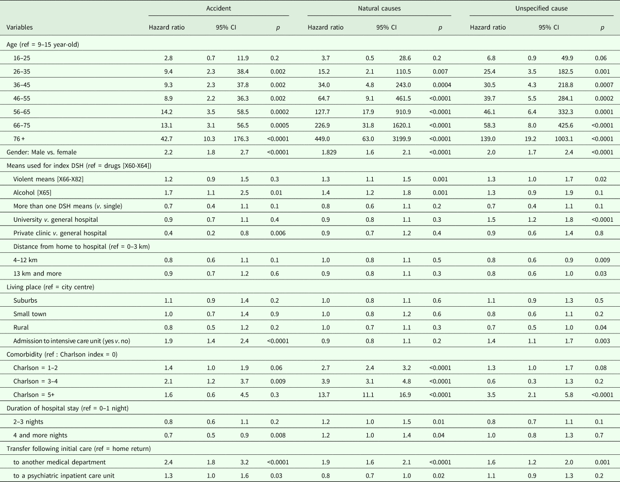 Cox regression model showed that recurrence of a DSH was also associated with an increased risk of overall mortality (HR = 1.98 [1.78–2.21]) and was related to suicide (HR = 2.30 [1.92–2.75]) but also accident (HR = 2.70 [2.06–3.55]), natural causes (HR = 1.44 [1.15–1.79]) and unspecified causes (HR = 2.15 [1.68–2.75]).