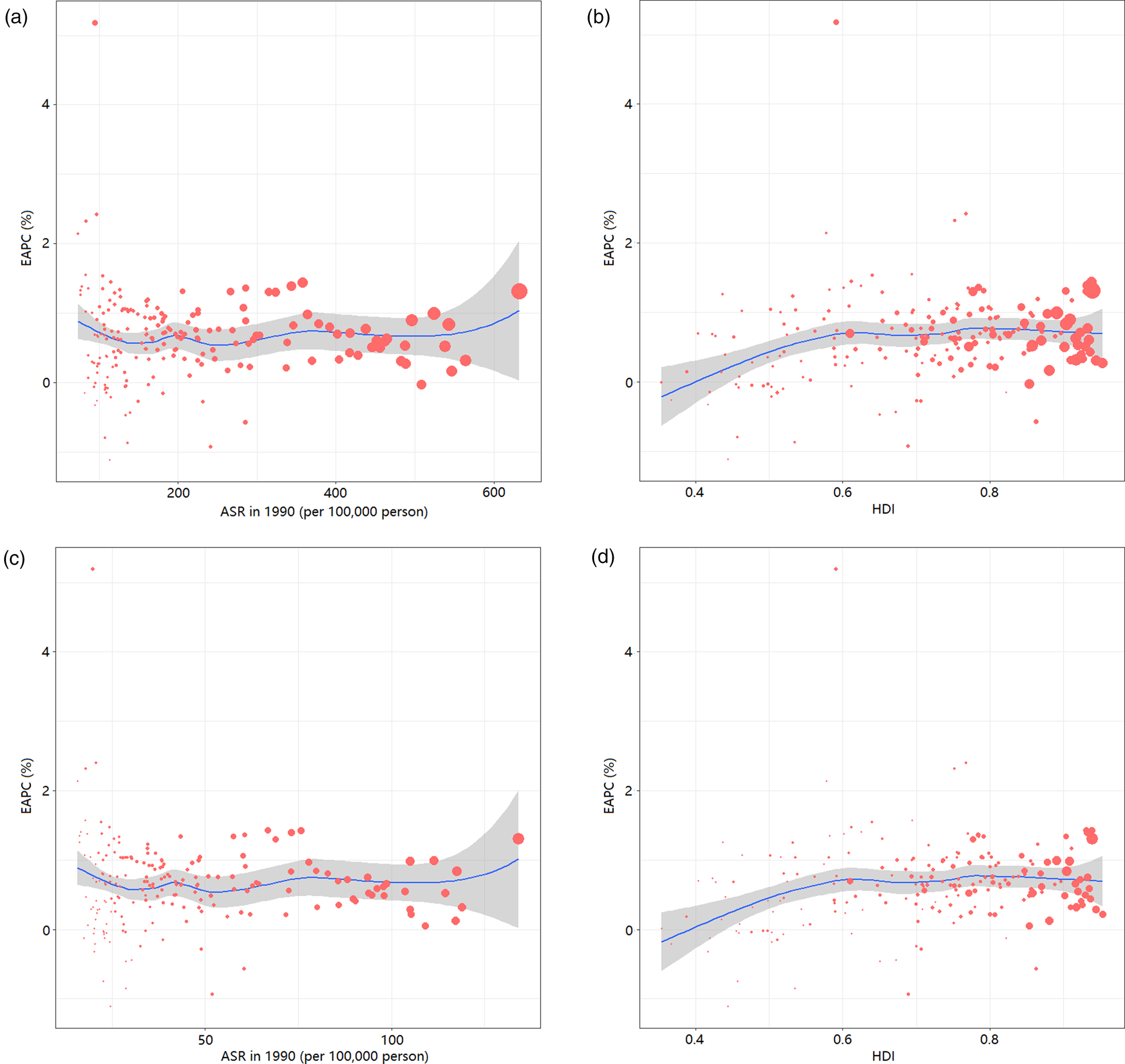 Fig. 6. Correlation between the EAPC of age-standardised prevalence rates and the age-standardised prevalence rates in 1990 (a); the EAPC of age-standardised prevalence rates and the HDIs in 2017 (b); the EAPC of age-standardised DALY rates and the age-standardised DALY rates in 1990 (c); and the EAPC of age-standardised DALY rates and the HDIs in 2017 (d). The size of circle represents the age-standardised rates of prevalence or DALYs in this country or territory in 2017. DALYs, disability-adjusted life years; EAPC, estimated annual percentage change; HDI, human development index.