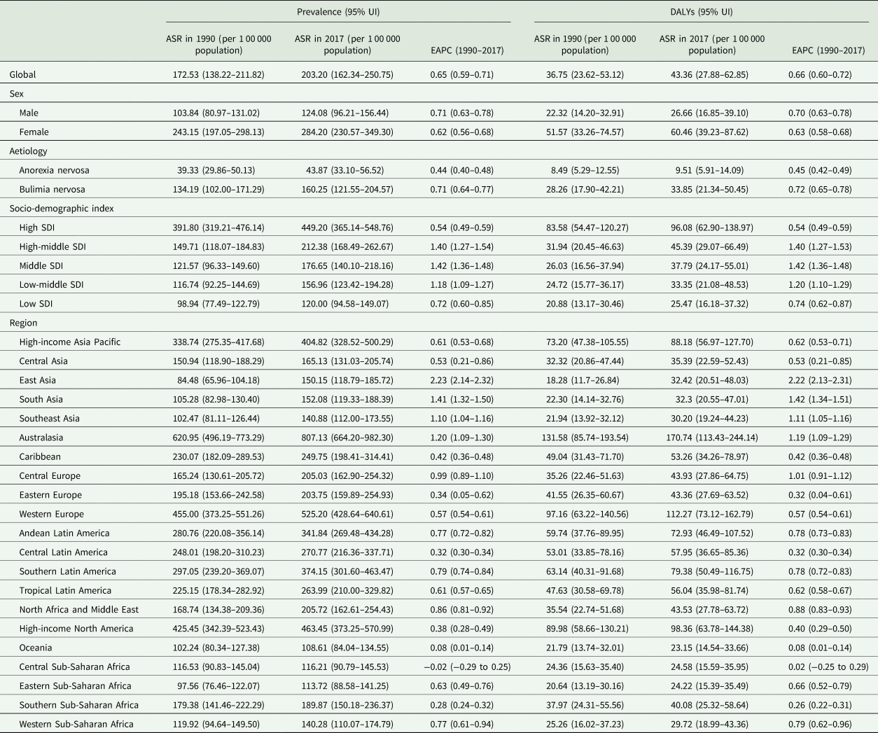 Table 1. Age-standardised rates of prevalence and disability-adjusted life-years of eating disorders in 2017 and their temporal trend from 1990 to 2017 at global and regional levels
