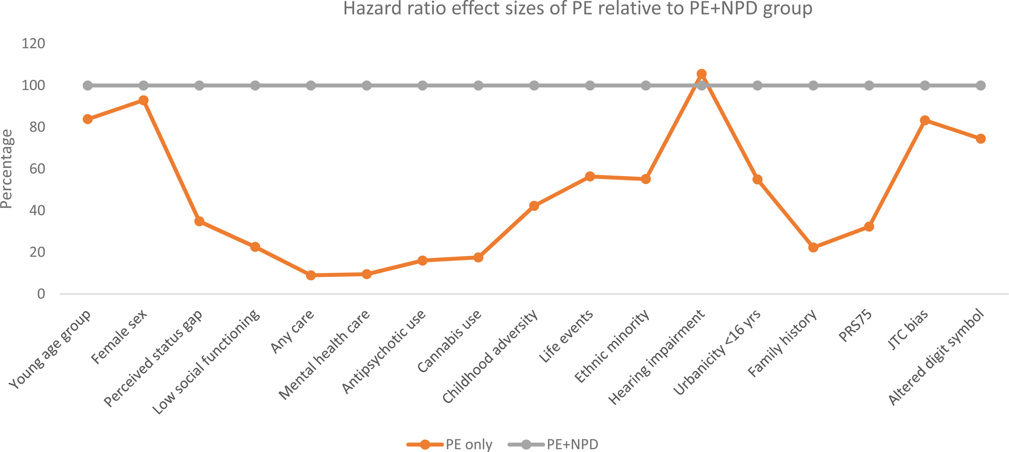 Fig. 1. Hazard ratio (HR) effect sizes of binary clinical, demographic, aetiological and cognitive factors in PE-only group relative to effect sizes of PE + NPD group (set at 100%, grey line). Young age group: aged 18–35 years; Perceived status gap: difference between actual and desired social position; Low social functioning: SF36 social functioning 75th percentile cut-off; Any care: any informal, medical or mental health care for mental problems or addiction; Cannabis use: once per week or more in the period of most frequent use; Childhood adversity: 80th percentile cut-off continuous adversity score before age 16 years; Life events: at least one life event in the last year; Minority: Moroccan, Turkish, Surinamese, Antillean, Indonesian or other non-western ethnic group; Hearing impairment: T0 deafness or serious hearing impairment in the past 12 months; Urbanicity: 2 highest levels of 5-level urbanicity classification before age 16 years; Family history: family history mental disorder; PRS75: schizophrenia polygenic risk score 75th percentile cut-off; JTC: beads task decision 2 or less beads; Altered digit symbol: cut-off 75th percentile continuous score.