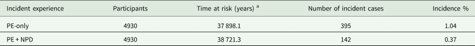 Two outcomes were defined to test the hypotheses regarding PE in relation to the context of NPD. The first was defined as PE without NPD, the second as PE in the co-presence of NPD. For each group we established (i) the incidence and (ii) associations with cognitive, clinical, demographic and aetiological variables, expressed as hazard ratio's (HR) and their 95% confidence intervals (CI) from Cox proportional hazards regression.