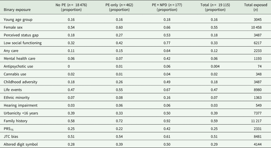 The sensitivity analysis with the more restricted risk set, excluding all participants with PE at baseline revealed results that were very similar to the results in Table 3, quantitatively and qualitatively (online Supplementary Table 5). The other sensitivity analysis restricted to individuals aged 18–35 at baseline (n = 1439, 26%) similarly revealed a very similar pattern of results (online Supplementary Fig. 2). Finally, for the measures split at the xth percentile (social functioning, digit span, childhood trauma, PRS) results for the continuous exposures yielded similar significant discrimination between PE-only and PE + NPD for social functioning, childhood trauma and PRS, and similar lack of significant discrimination between PE-only and PE + NPD for digit span (online Supplementary Table 6).