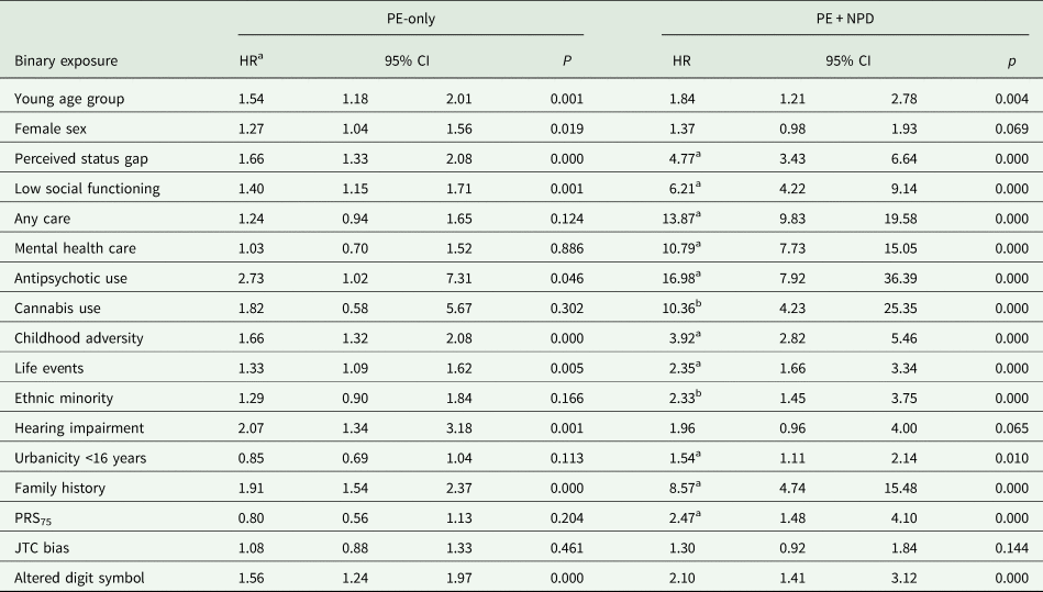 The distribution of clinical, demographic, cognitive and aetiological factors tended to be different across the PE-only and PE + NPD groups, in comparison with the remainder of the sample, for most variables (Table 2). online Supplementary Table 3 displays the pattern of time-varying and time-constant exposures for the PE-only and PE + NPD incidence analysis. Online Supplementary Table 4 details the person-years, failures and incidence rates of PE-only and PE + NPD as a function of the various binary demographic, clinical, aetiological and cognitive risk factors. Hazard ratios are presented in Table 3 and the pattern of results is summarised in Fig. 1.