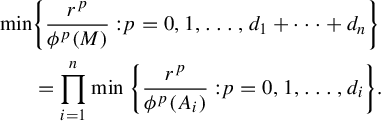 $$ \begin{align} \min&\bigg\{\frac{r^p}{\phi^p(M)}:\! p=0,1,\ldots,d_1+\cdots+d_n\bigg\}\nonumber\\ &=\prod_{i=1}^n \min\bigg\{\frac{r^p}{\phi^p(A_i)}:\! p=0,1,\ldots,d_i\bigg\}. \end{align} $$