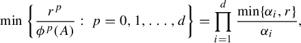 $$ \begin{align*}\min\bigg\{\frac{r^p}{\phi^p(A)}:\; p=0,1,\ldots,d\bigg\}=\prod_{i=1}^d\frac{\min\{ \alpha_i, r\}}{\alpha_i}, \end{align*} $$