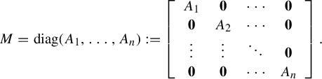 $$ \begin{align*}M=\mathrm{diag}(A_1,\ldots, A_n):=\left[ \begin{array}{cccc} A_1 & {\textbf{0}} & \cdots & {\textbf{0}}\\ {\textbf{0}} & A_2 & \cdots & {\textbf{0}}\\ \vdots & \vdots &\ddots & {\textbf{0}}\\ {\textbf{0}} & {\textbf{0}} & \cdots & A_n \end{array} \right]. \end{align*} $$