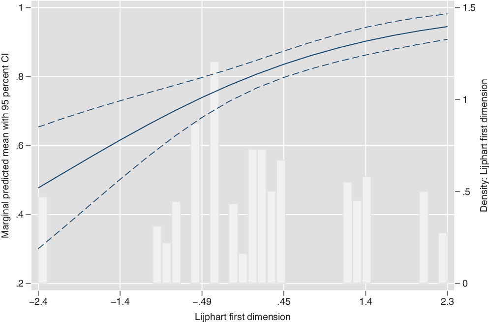 Figure 3. Predicted support for consensus democracy along Lijphart’s parties-executive (first) dimension.