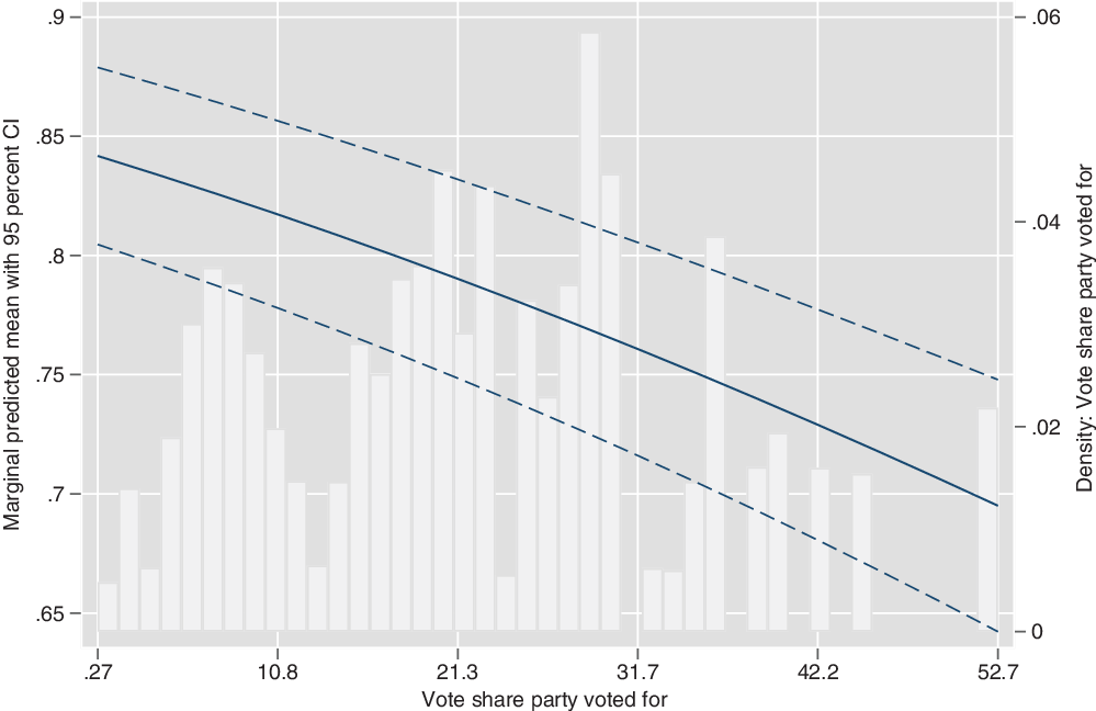 Figure 4 summarizes how the probability of thinking that consensus political systems are best for democracy changes as a function of the size of the party one votes for (the histogram in the background summarizes the distribution of the variable measuring the vote share of the party). For example, the predicted support for consensus democracy for an individual who votes for a very small party (1 percent of the vote share) equals 0.84, while this support among someone who votes for a party that obtains half of the vote share equals 0.7. These results, which are in line with our second hypothesis, indicate that a person’s position as a political majority or minority is a relevant correlate of the model of democracy she supports. In line with the idea that political minorities are likely to be better off in consensual systems, being a voter of a small party substantially increases the likelihood of thinking that the best model of democracy is a consensual one.
