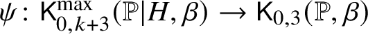 $\psi \colon \mathsf {K}_{0,k+3}^{\max }(\mathbb {P}|H,\beta ) \to \mathsf {K}_{0,3}(\mathbb {P},\beta )$ and