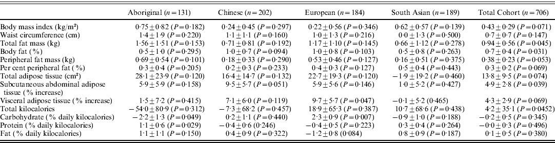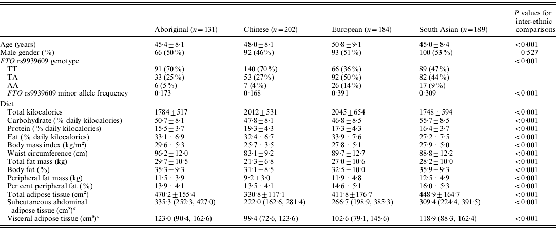 Table 1 outlines the minor allele and genotype frequencies, and the outcome variables. The minor allele and genotype frequencies differed among the ethnic groups (P<0·001). Europeans and South Asians had greater minor allele frequencies compared with the Aboriginals and Chinese (P<0·001 for all comparisons). There were no differences between the Europeans and South Asians, or the Aboriginals and Chinese. Dietary and anthropometric measures were significantly different across the four ethnic groups (P<0·001 for all).